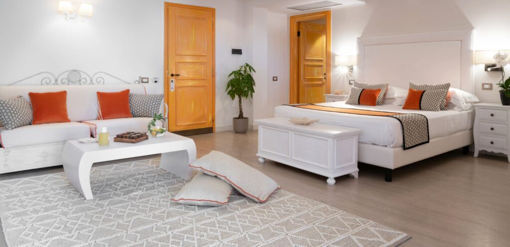 The Junior Suite Janas (about 40 sqm) is located on the ground floor with a patio directly on the lawn, with partial sea view. Double bed and open living room with double sofa bed, for a maximum occupancy of 4 guests aged 12 and over. Private gazebo in the garden with two sunbeds on the 2nd row, sea front, with soft drinks and coffee included at the beach bar. The room features wi-fi, satellite TV, air-conditioning, phone, minibar, safe, bathroom with hydromassage shower cabin, hair dryer, bathrobe and sleepers, coffee machine and kettle.