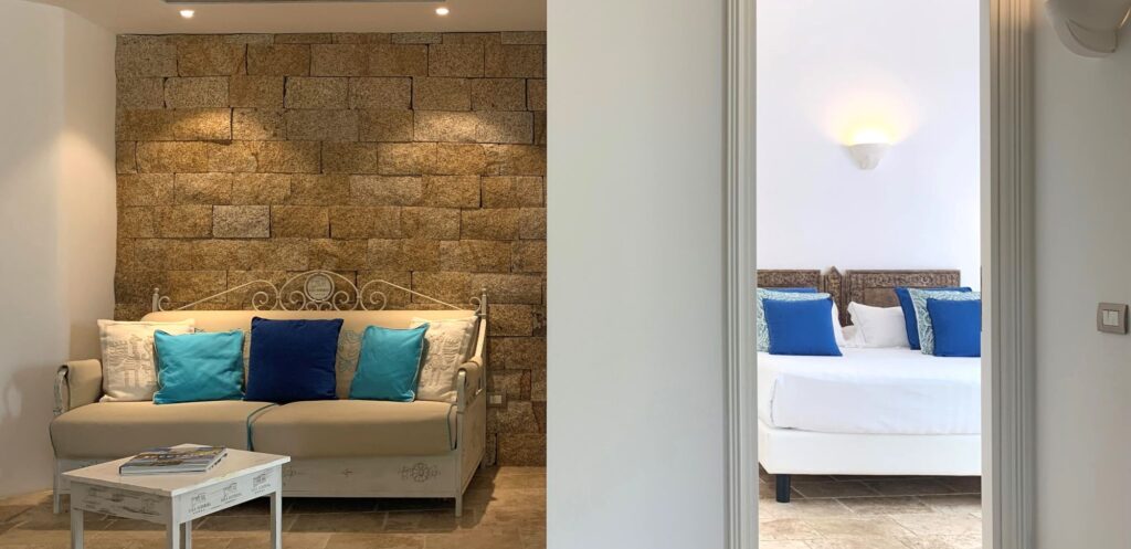 The Suite Ena Garden Side of Hotel Cala Caterina (65 sqm.) is located on the ground floor. It is composed by a double room, a separate living room with sofa bed. It can accomodate up to 4 guests aged 12 and over. Private gazebo in the garden with two sunbeds on the 2nd row, sea front, with soft drinks and coffee included at the beach bar. The room features wi-fi, 2 satellite TV, air-conditioning, phone, minibar, safe, bathroom with shower and bathtube in the living room, hair dryer, bathrobe and sleepers, coffee machine and kettle.